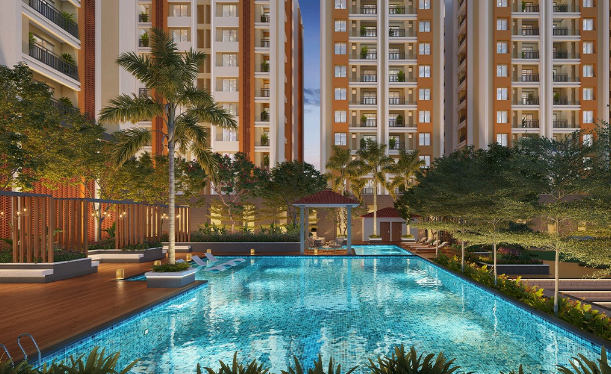 Residents can enjoy clubhouse, wellness spaces, landscaped gardens, swimming pool, gym, kids’ play area, indoor games, yoga zone, and banquet facilities.