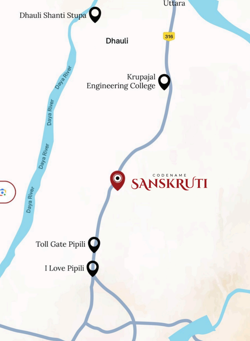 Codename SANSKRUTI is located on Puri Bypass Road (NH 316), Bhubaneswar, offering excellent connectivity to both Bhubaneswar city center and Puri.